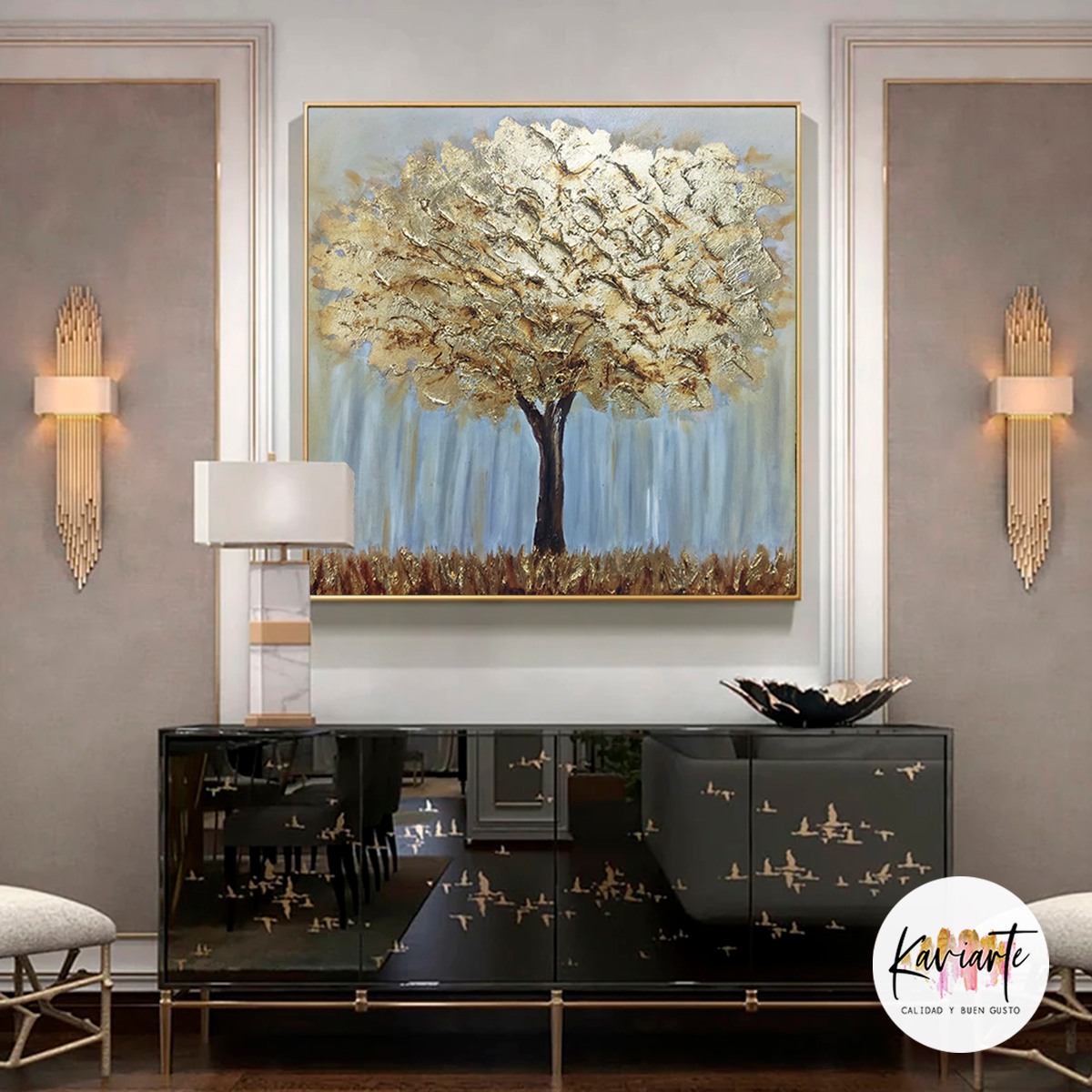 Hermoso cuadro pintado al óleo, trabajado con espátula, con finas texturas y detalles en pan de oro.